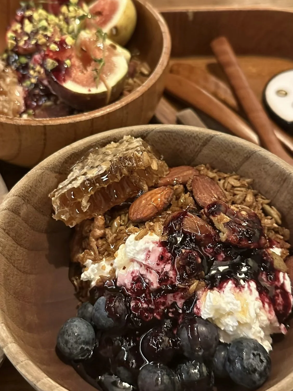 I tried one of their bowl-style items too — granola, berries, whipped cream, honeycomb, and fruit (mine had blueberries, almonds, honeycomb, and a berry sauce).