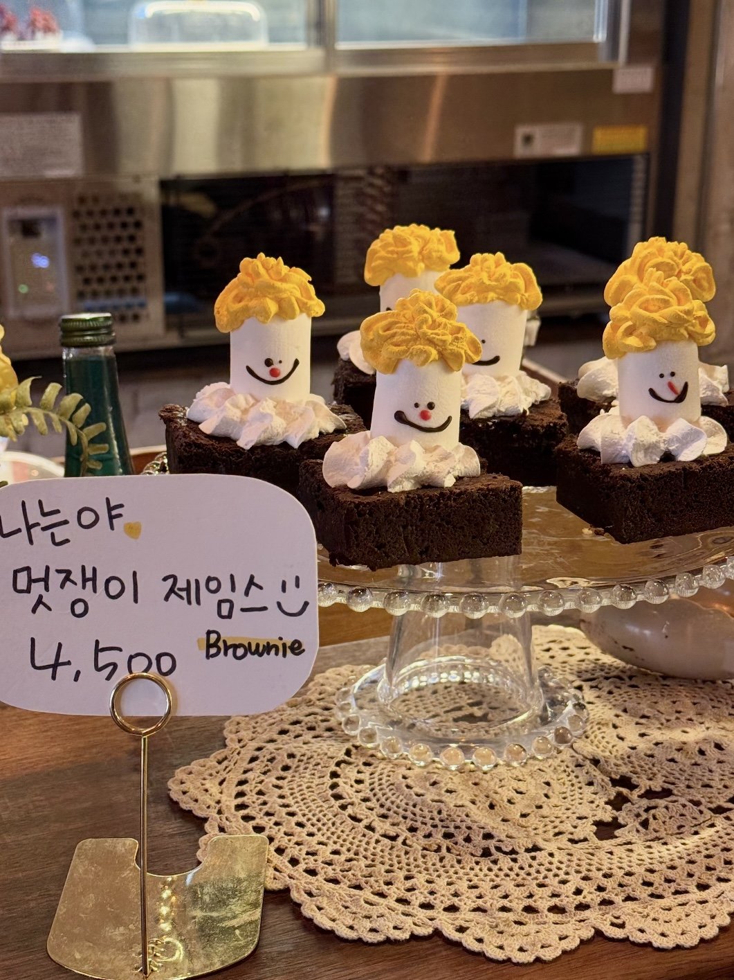 But because each brownie has a little marshmallow character sitting on top — with a yellow “hair” swirl, tiny chocolate-dot eyes, and a red nose.