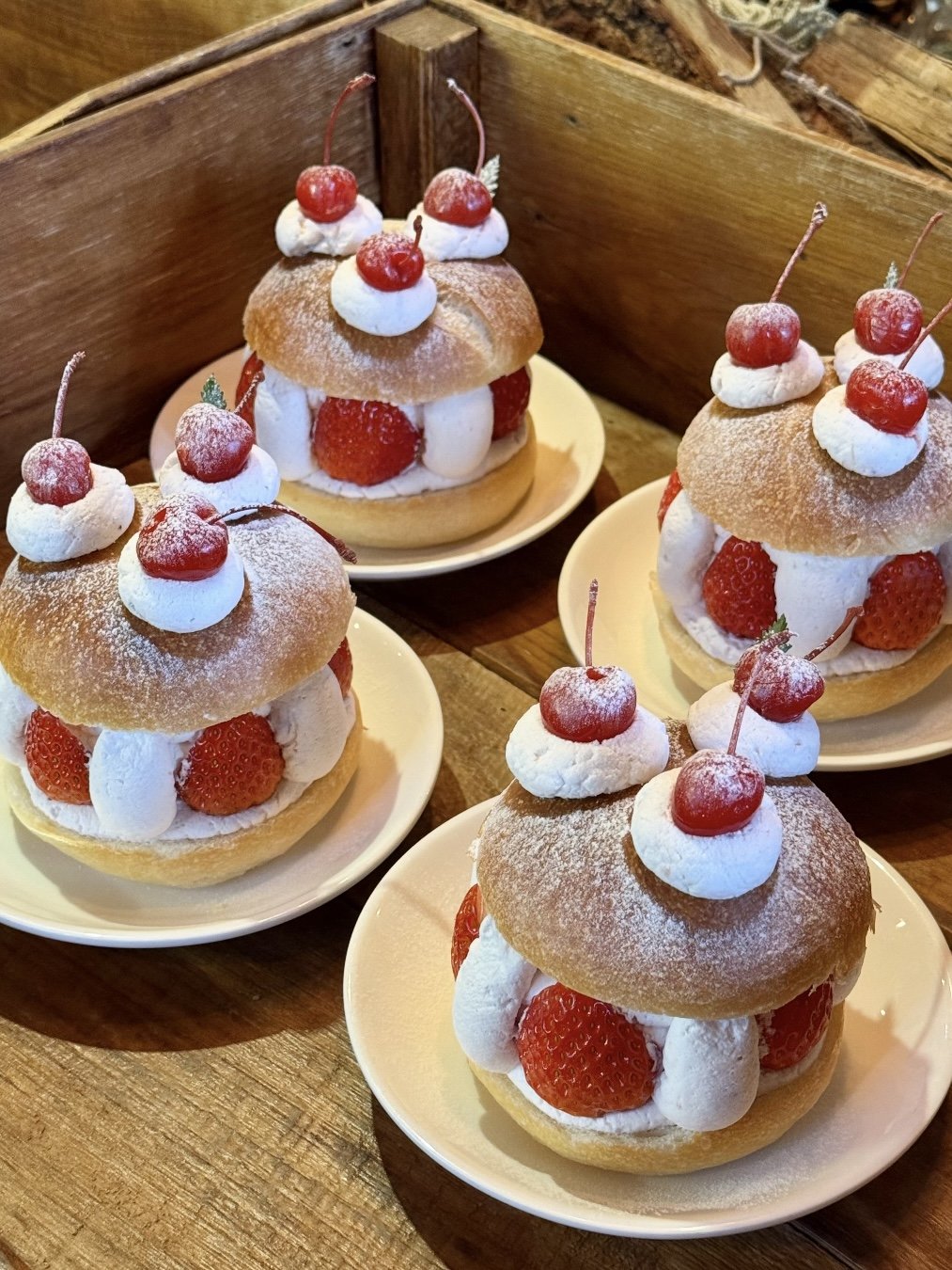 Round, soft buns split in half, filled generously with whipped cream and fresh strawberries, topped with powdered sugar and cherries. They look like miniature celebration cakes more than simple bread.