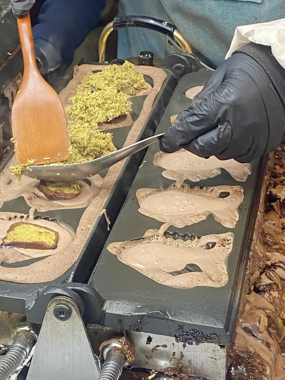 The vendor pours thick chocolate batter into the fish-shaped mold. Before it sets, generous scoops of pistachio filling and toppings are added. Then more batter seals it shut before the iron presses close.