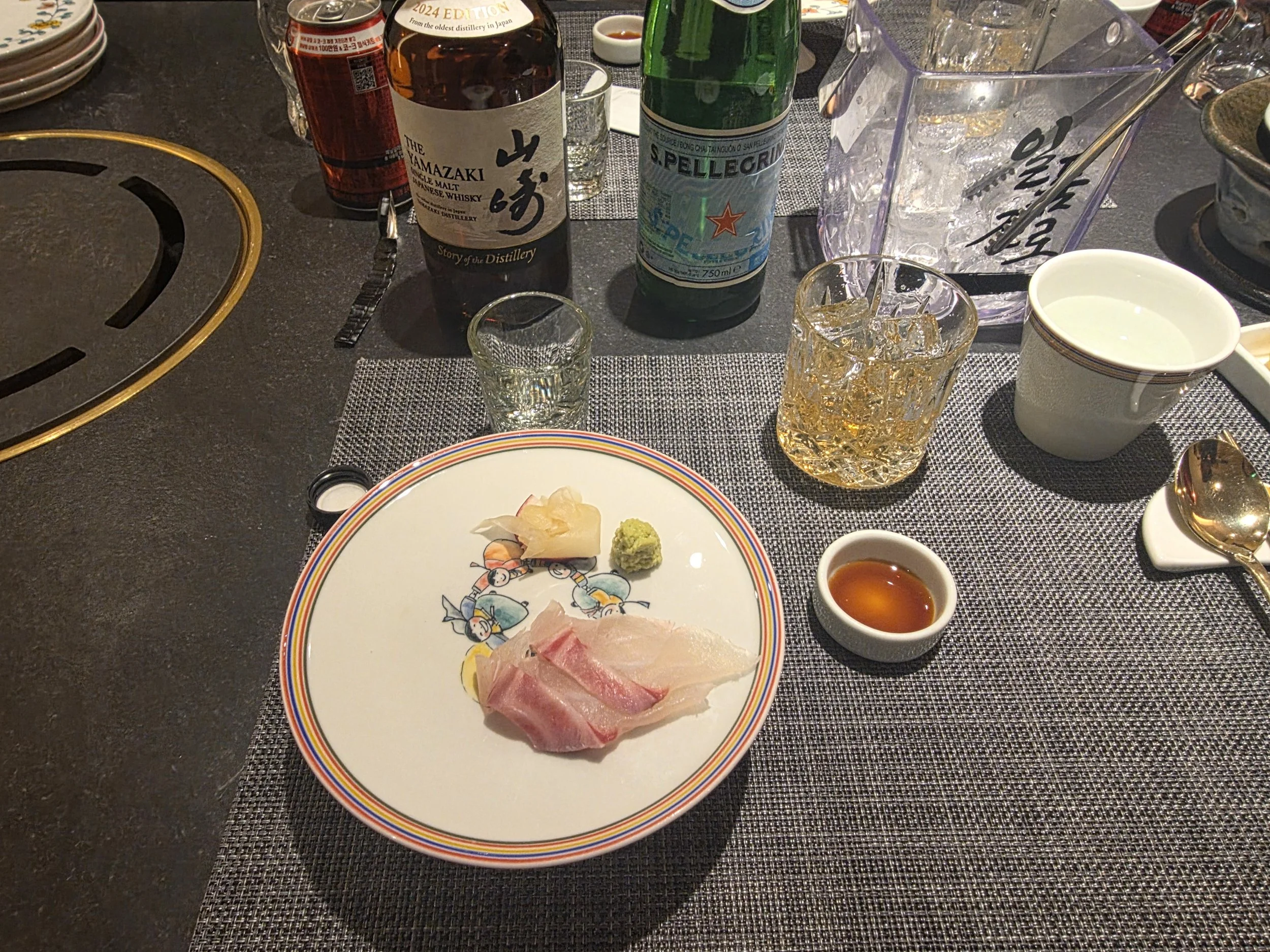 Neatly sliced raw fish, served simply with soy sauce and wasabi, paired with drinks already on the table—Japanese whisky, sparkling water, and soju nearby. It’s not flashy, but it’s thoughtful.