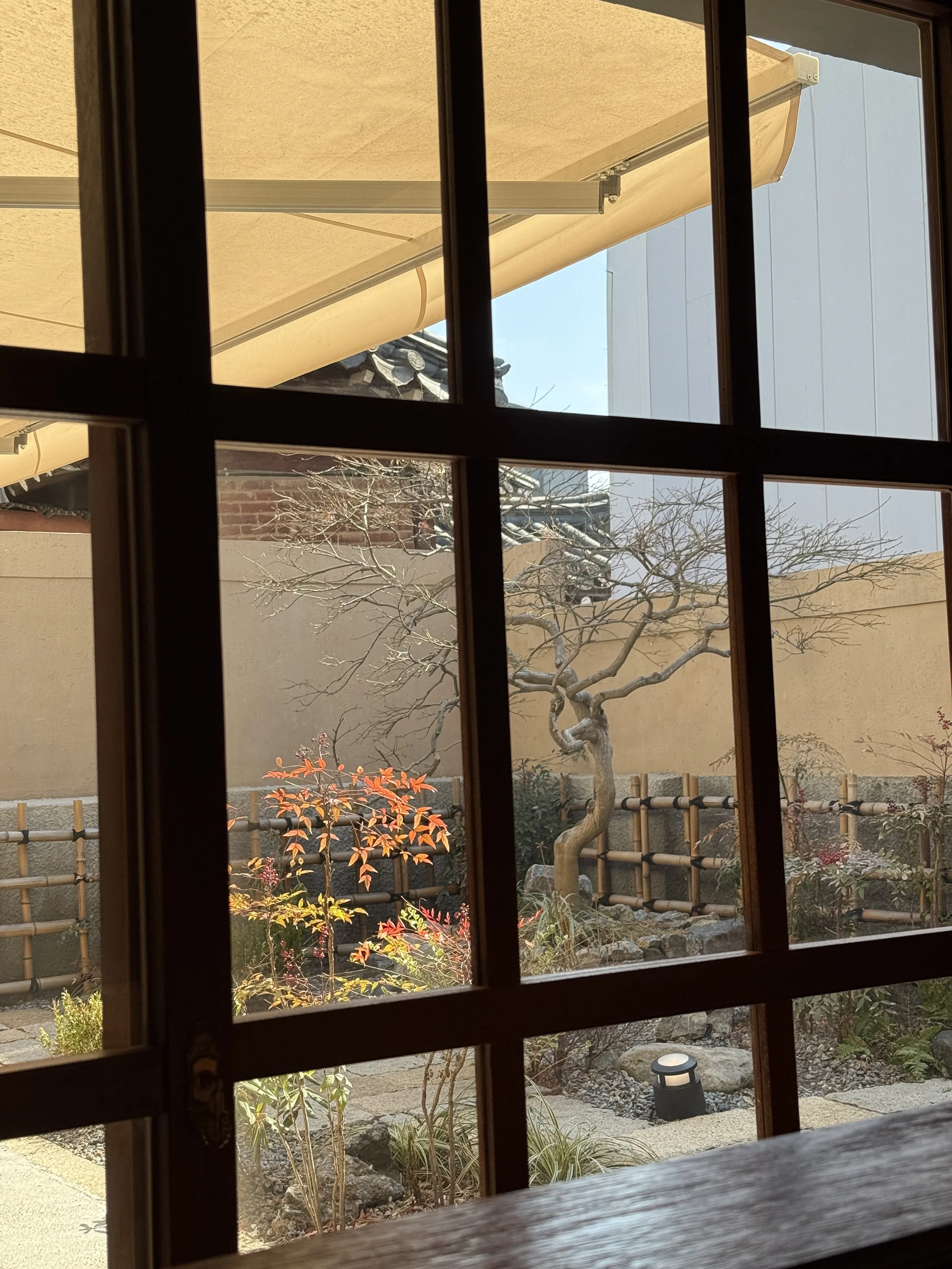 Our seats happened to face a small courtyard visible through a wooden window.